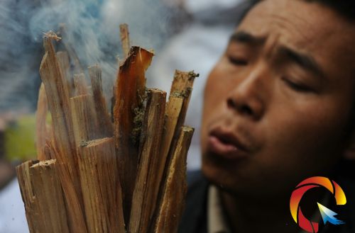 一名苗族村民在祭尤節的祭祀儀式上用傳統的方式點燃祭火
