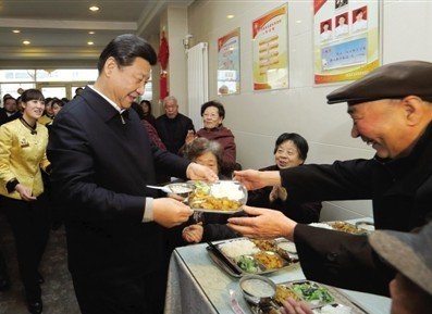 2月4日,習(xí)近平來到蘭州一家養(yǎng)老餐廳,端起盛滿飯菜的餐盤,走到72歲的老人楊林太面前,請他用餐。新華社記者 蘭紅光 攝