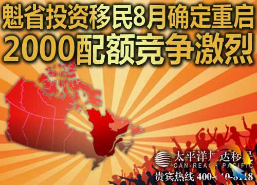 目前,太平洋加達移民已經開啟魁北克投資移民2013年搶案快捷通道,歡迎您隨時登陸http://www.pacificimmi.cn搶先預定珍稀配額,6月30日前更有超值驚喜優惠!