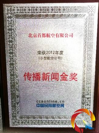 2013年7月21-24日,《中國民用航空》雜志、中國民用航空網年會及民航輿情研討會暨2012年度新聞傳播頒獎典禮在拉薩舉行。首都航空榮獲2012年度小型航空公司新聞傳播金獎。