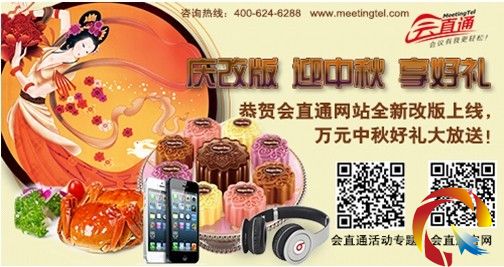 在官網上線的同時,為感謝新老客戶一直以來對會直通的支持和厚愛,在中秋佳節來臨之際,會直通還特別送出萬元中秋好禮以表答謝!活動時間為8月30日-9月30日,只要登錄會直通官網并注冊為會員,即可馬上獲得精美可愛的毛絨手機底座;作為會直通已有用戶,只要充值、消費一定金額,即可獲得精美中秋好禮,IPhone5、IPad、捷安特自行車、哈根達斯冰淇淋月餅、陽澄湖大閘蟹……真是活動多多,禮品多多。