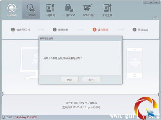 一旦發現有惡意應用或木馬植入,會立即彈出警告。點擊取消即可立刻終止刷機進程。