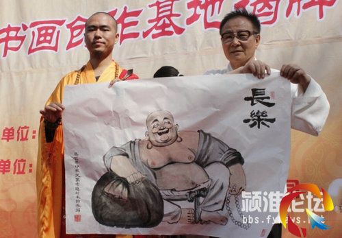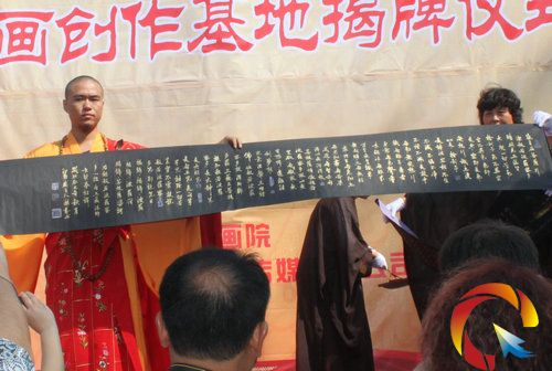 北照寺住持上廣下行法師與阜陽市文聯主席任智先生共同為“廣行書畫創作基地”揭牌,一百多名書畫家揮毫潑墨,舒展丹青,凈土院內懸掛的一百多幅全國知名書畫家精品,使賢主嘉賓承接法雨甘露之時,共享藝術盛宴。