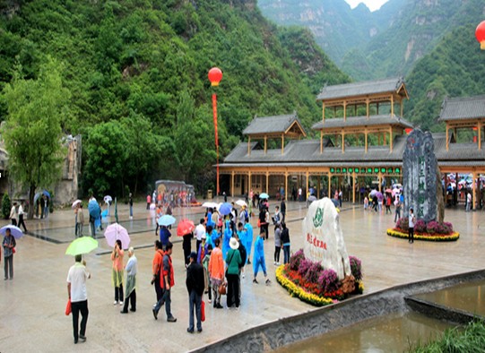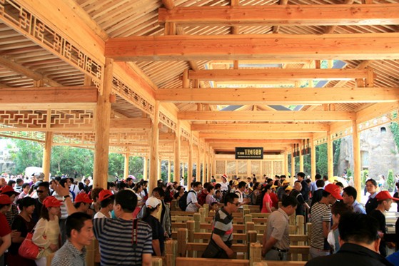 百里峽檢票通道位于售票大廳里側,整個檢票通道被全部為木質結構的仿漢代長廊所籠罩。該長廊長52米,寬11米,灰瓦黃柱,古香古色,配以百里峽的山水,遠遠望去,莊重大氣。如此設計不光為了美觀,還有其實用的一面。當游客在檢票通道檢票,突遭雷雨之時,這時檢票通道的外面建筑就起到了遮雨的作用。