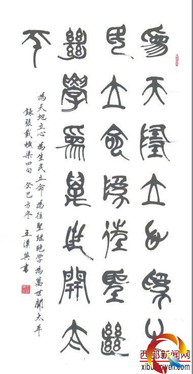 核心提示:王漢英男西安市長(zhǎng)安區(qū)人,1952年生,西安市書法家協(xié)會(huì)員,西安于右任書法學(xué)會(huì)會(huì)員,長(zhǎng)安楹聯(lián)書畫院理事,陜西詩(shī)詞書法研究會(huì)長(zhǎng)安分會(huì)副會(huì)長(zhǎng)。深受其父和傳統(tǒng)文化熏陶,自幼酷愛書法,摹唐楷,臨圣教,習(xí)漢隸,研篆書。參加中國(guó)書法創(chuàng)作高級(jí)研究班進(jìn)修。潛心研習(xí)篆書,其大篆作品雄奇恣放,古趣盎然;小篆通宛靜穆,精致典雅;其運(yùn)筆開合相寓,剛?cè)嵯酀?jì),頗俱太極風(fēng)韻。作品多次參加省市及全國(guó)書法展,屢次獲獎(jiǎng)。入編《前進(jìn)中國(guó)書畫雅賞》《中國(guó)當(dāng)代優(yōu)秀書畫珍跡選輯》《中國(guó)書畫界精英作品大成》《楊凌杯優(yōu)秀作品集》《遠(yuǎn)古上林追夢(mèng)湯泉書畫集》