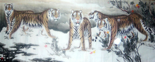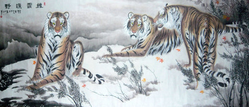 記得幾年前,現任《亞洲論壇》副總編劉瀚鍇先生應邀來我家做客,隨他同來的一位個子不高,微胖、但很精干的普通男子,就是劉瀚鍇先生向我多次推薦,多次提起的,自幼酷愛繪畫,勤奮好學,特別鐘情于畫虎的“虎癡”畫家敖特。敖特在書畫界已經嶄露頭角,頗有名氣了。最近,敖特又出了一本新的畫冊,因此,劉先生請我為他作序,并帶來了敖特最近的部分新作,綜合敖特對畫虎的癡迷程度,敖特確實把“獸中之王”的老虎表現的淋漓盡致,栩栩如生,敖特的《雪野雙雄》、《山君臥雪》、《威震大千》、《嘯月》等作品,大氣傳神,筆墨流暢;敖特在傳統畫虎基礎上推陳出新,大膽探索,結合古今畫虎名家之風格,不斷進取,把虎的造型和威猛從技法上求突破,從而形成了自己的畫虎新風。