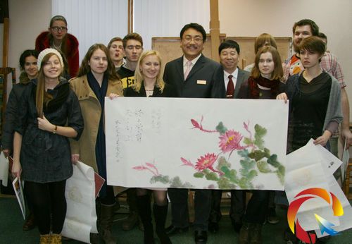 畫展開幕之前,崔景哲先生還應白俄羅斯國立藝術大學的邀請,專門為白俄羅斯大學生和中國留學生分別講解了中國畫的傳統技法,水墨的運用和處理方法,并為大學生們親自示范。短短幾分鐘的時間,一幅精美的中國小寫意花鳥畫作品悄然而成。藝術大學老師莎莎和大學生們紛紛向崔景哲先生報以陣陣的熱烈掌聲!