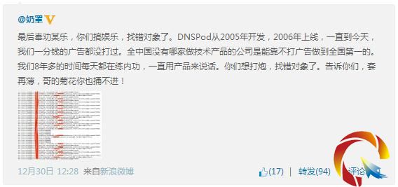 11月30日,吳洪聲再次微博發聲以非常粗俗的語言,對加速樂進行抹黑。而這一切的起因,皆因加速樂推出DNSPOD同類功能,動了DNSPOD的奶酪所致,眾所周知,目前在第三方DNS解析廠商中,DNSPOD解析域名數量第一,加速樂認為:加速樂推出智能DNS功能的初衷是為了讓用戶更多一種選擇。將競爭對手的同類功能,認為是加速樂“找錯對象了”,加速樂深感震驚:難道這個行業已經容不下第三方的參與了嗎?給用戶更多選擇是“找錯對象”?