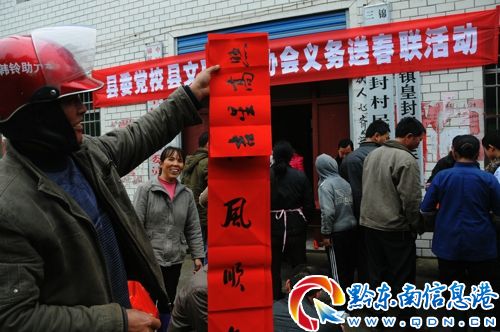 當天,錦屏縣委黨校和縣文聯組織縣書法協會會員,帶上筆墨和100多張大紅紙,為皇封村群眾書寫和贈送春聯200多副,同時向群眾贈送100多冊書籍。進入新年以來,錦屏縣組織幾支文化小分隊,分別到三江鎮、大同鄉、偶里鄉等鄉鎮開展“送文化進村寨”活動,為農村群眾送上精神食糧,也送去了新年的祝福。(楊秀廷 攝)