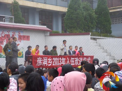 9月4日上午8點(diǎn),彥洞鄉(xiāng)在黃門民族中學(xué)舉行2013年度新兵入伍歡送儀式,鄉(xiāng)領(lǐng)導(dǎo)班子、入伍新兵、新兵家長、黃門村兩委成員、黃門村腰鼓隊(duì)及群眾到場歡送。