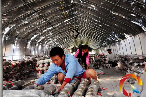 鐘靈鄉(xiāng)陽艾村香菇種植戶正在搬移菌棒