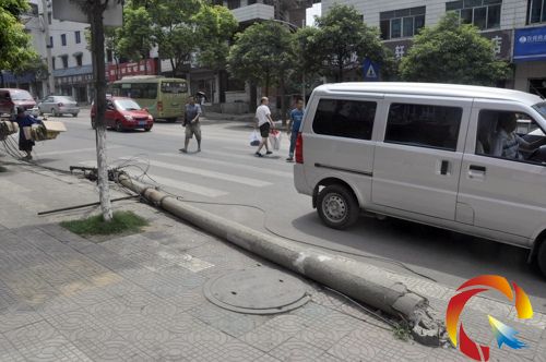 記者在現(xiàn)場看到,4米左右的空心電桿根部幾乎已經(jīng)完全斷掉,只有幾根鋼筋相連。電桿的另一頭,幾根纜線掛在行道樹上,還沒有完全落在地上。