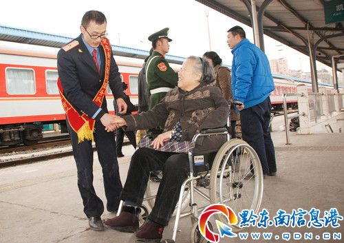 3月3日,成都鐵路局凱里火車站青年志愿者在抬著一名來(lái)自北京81歲,名叫張淑蘭重點(diǎn)旅客進(jìn)站準(zhǔn)備登上T88次列車。
