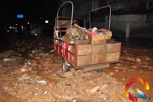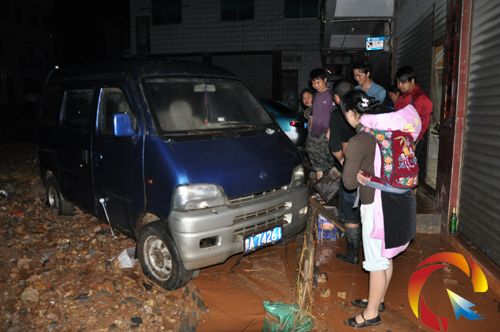 記者在現場看到,屯上村村頭公路和橋頭老車站停車場堆積了大量的泥沙和石塊,堆積最多的地方厚度達五十公分左右,停放在停車場內的小型車輛,輪子有一半被埋在泥沙里,少量的紅色泥水還在流進農戶家中,該鎮政府值班領導干部與村干正在現場指揮群眾引水排洪和開展防護工作。