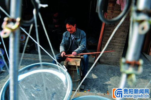 圖為凱里市城區的一條老街上,一位老手藝人沿用古老的傳統,執著守候著秤桿制作手藝,被稱為“城市最后的桿秤制作藝人”。(胡雁)