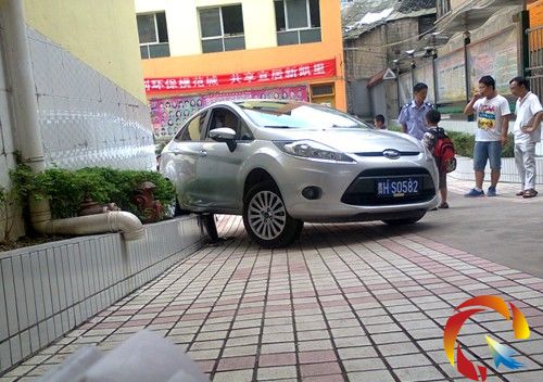 6月26日中午11點40分,凱里市第五小學校門口,一輛銀灰色福特車不知何故突然快速后退,猛撞在大門右邊的花壇邊墻上,將邊墻撞爛,然后后輪神奇般地飛騎在高約90公分的花壇上使整輛車懸空,所幸未造成人員傷亡。