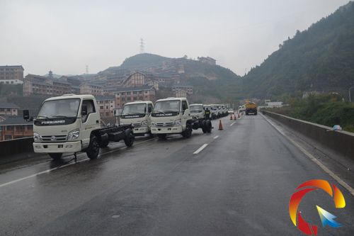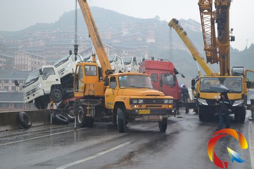 接到報警后,凱里高管處凱里路政執法大隊立即趕赴現場救援。由于掛車部分懸在橋梁外面,車上又滿載小貨車,需要用兩輛吊車穩住掛車后,再把掛車上的小貨車一輛一輛卸下來,最后將掛車和小貨車一輛一輛拖離高速公路。