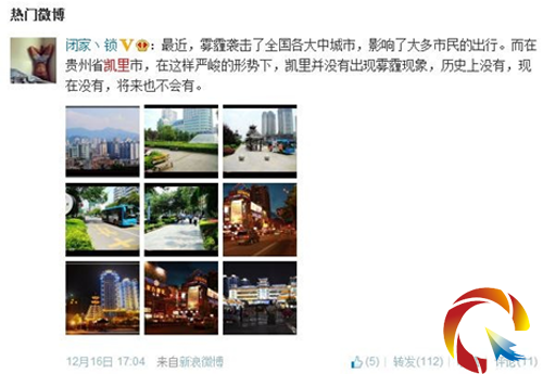 最近網上一條熱門微博,引起記者的關注,此微博說明了最近霧霾天氣給市民帶來了一定的影響,但在貴州省凱里市,并沒有出現霧霾現象,可見凱里的原生態環境存在較強的優勢。