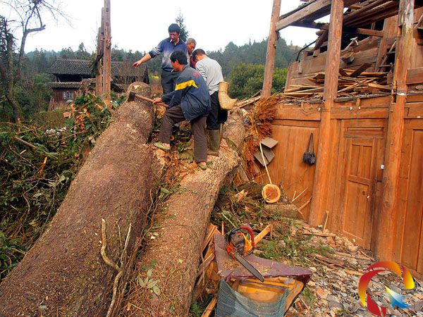3月24日凌晨3時至上午7時,黎平縣地坪等多個鄉(xiāng)鎮(zhèn)遭強(qiáng)雷風(fēng)暴的襲擊,造成慘重?fù)p失。據(jù)財保公司黎平支公司接到報案統(tǒng)計(jì),全縣共有470多戶農(nóng)戶房屋不同程度損壞。圖為黎平縣德鳳鎮(zhèn)地西村一姓周的農(nóng)戶的房子被風(fēng)暴掀翻的百年大樹壓跨的情形。據(jù)悉,事發(fā)時,戶主及其家人及時轉(zhuǎn)移,因而未造成人員傷亡。(陸書明 毛軍)