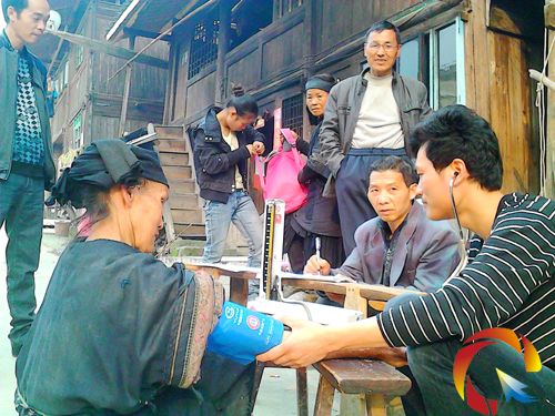 醫護人員認真為每一位群眾進行了血壓、血糖、血脂等方面的常規性檢查,對部分患者進行詳細診治,并為每位群眾建立了《健康檔案》。同時,向廣大村民宣傳衛生科普、疾病預防、健康素養和新農合政策等知識,現場為群眾答疑釋惑。圖為醫護人員正在為一名苗族婦女量血壓。(楊代富)
