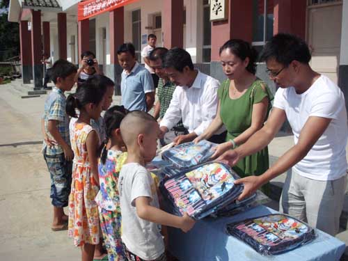 9名小學一年級移民新生還得到了縣扶貧生態移民工程辦公室捐贈的新書包和學習用具