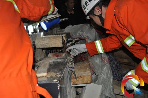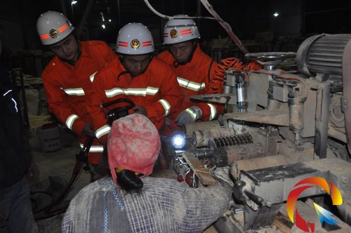 消防官兵到達現場后,發現女工的右手手掌被卡在多片鋸切割木材的鋸片之間,鋸齒已經深深嵌入肉中,其他工人用千斤頂將裝有鋸片的滾動軸頂起,以緩解女工的痛苦。經過救援人員現場分析,只有將多片鋸完全拆開,才能將女工所受的傷害降至最低。隨后,消防官兵利用救援器材進行切割、剪切,大約半個小時后成功將女工救出。