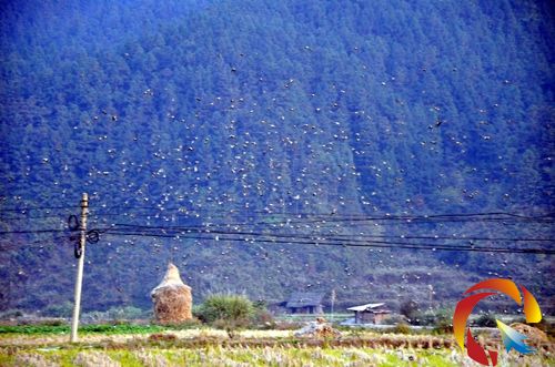 12月7日,記者在黎平縣敖市鎮王家塝的稻田里,看到一群鳥雀正忙著覓食。后來,記者發出了一聲吆喝,這些麻雀“撲騰”地從地面上飛起來,密密麻麻的,足有上千只。