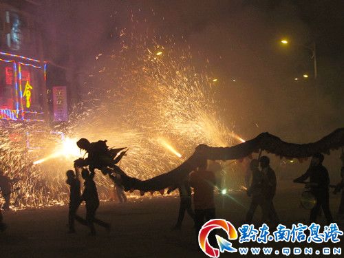 2月24日,是傳統的新春元宵節。傍晚17:00-18:00,雷山縣城城郊居民男女老少扶老攜幼,近3萬余眾從三村五寨陸續匯集縣城鬧元宵。晚上19:00開始,“咚咚鏘、咚咚鏘、咚咚鏘” 二十條龍匯聚縣城大十字,各顯神通、竭盡所能翻騰飛舞在縣城,表演給城鄉群眾觀看。接著,上百筒火藥筒從東南西北四個方向憤怒般吐著火舌熏向群龍,龍陣在呼嘯震天的火光中接受煙火的攻擊,此時,鞭炮、沖天炮、煙花炮齊鳴,滿天禮花、遍地響聲,萬眾齊歡。接著,群龍散陣,沖向不同的街巷,火筒、人群隨之而去,激烈的鞭炮聲、沖天的火焰光,在縣城各街巷此起彼伏,連接不斷,整個小縣城歡騰了……