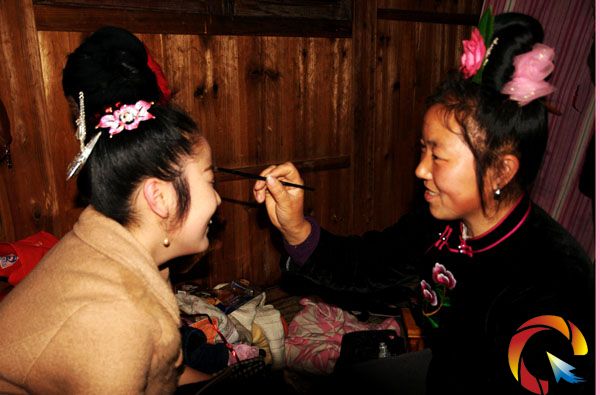 苗寨姑娘在為即將出嫁“新娘”化妝