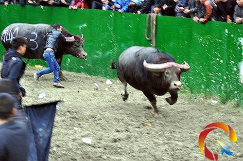 A組的比賽在中午12點(diǎn)開始上演,首戰(zhàn)由來自麻江的10號斗牛與云南“擎天柱”對弈。麻江10號先進(jìn)場“候戰(zhàn)”。2分鐘左右,云南牛王由6名彪雄大漢牽著走進(jìn)了斗牛場,好不威風(fēng)。據(jù)了解,因?yàn)樗獠缓茫娕>痛颍员仨氂闪?ldquo;護(hù)駕”……由六人護(hù)送,也是本次斗牛賽組委會特許的。
