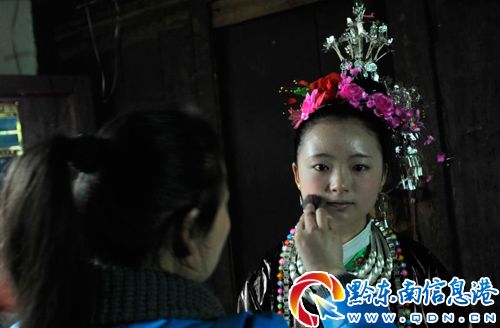 準備參加鼓樓搶雞活動的侗族姑娘們正在打扮