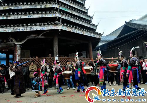 參加鼓樓搶雞活動的侗族姑娘挑著禮物在寨老的帶領下到達從江縣貫洞鎮干團村鼓樓前。