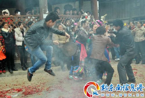 2013年2月11日,大年初二,從江縣貫洞鎮干團村侗寨侗族同胞在鼓樓前舉行鼓樓搶雞活動。下午兩點鐘,禮炮三響,搶雞活動便在鞭炮聲中開始,姑娘將一頭倒捆著公雞,一頭掛有飯囿(一種竹制的盛飯用具)的長扁擔在肩上,公雞在身前,飯囿在身后,女伴們在其后用手護著長扁擔,姑娘則用雞挑逗前來搶雞的表兄和其他想娶她的男青年一塊來搶,場面場面精彩熱烈,吸引來自浙江、黑龍江、廣東等省的游客前來觀賞。