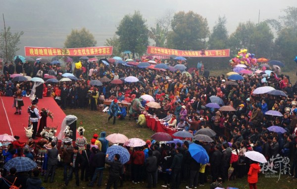 三月十五至十七日是節(jié)日的正式活動(dòng)時(shí)間,也是熱鬧的高潮。白天,姑娘們都身穿漂亮的衣裙,佩戴著華麗的銀飾,到郎西(地名,漢譯楊家坪)去觀看斗牛、斗雀;同與自己一道吃"姊妹飯"的男子們跳蘆笙和跳木鼓舞;夜里,又象十四日夜那樣,男女相聚在村中廣場或巷閭唱歌談情。這時(shí),姑娘們(分作不同年齡的許多批)用竹籃盛著各人的彩色糯米飯團(tuán)和魚、肉、鴨蛋等禮物,贈(zèng)送給兩天來陪伴她們的男子們。到來年姊妹節(jié)時(shí)候,這些青年男子們,集體籌錢買了禮物(繡花絲線、綢緞等等)盛在姑娘們?nèi)ツ曩?zèng)送禮物的竹籃里,帶回贈(zèng)送給姑娘們(叫還竹籃)。如此經(jīng)過多次的你來我往,使相互間的了解加深,進(jìn)而產(chǎn)生并傾訴愛慕之情,最終結(jié)為伉儷。
