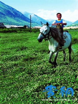 舒開的三個兒子各自居住一個大院,老人住在三兒子金斯別克家,也許因為金斯別克的兒子哈里木是他唯一 的孫兒吧。2歲多的時候,哈里木見到姐姐巴音齊齊格穿上漂亮的服裝跳舞,哭著也要穿;長大點后,他會開心地給來訪的客人一個個遞毛巾,但一夸獎他,他就會 把毛巾直接扔到客人臉上去。如今巴音齊齊格已經上學,不太熱衷于和我們一起玩耍,哈里木卻還是一個搗蛋鬼。哈里木的童年讓人嫉妒:清晨從貓兒的呼嚕中蘇醒 (那只野貓不知從哪里跑來的,已經被他治得服服帖帖,比家貓還乖,每天必須守著他才能睡得香),用來蘸野草莓果醬的大面包是媽媽親手烤制的,新鮮牛奶也是 媽媽早上才擠好燒開的。小家伙仿佛家里的少爺一般,也難怪,因為幾個叔叔的孩子都是女兒,他似乎成了這片領地的接班人,嬌縱得讓牛、羊、小狗、小貓都怕 了。有一次他鉆在馬肚子下玩,被馬踢了一腳,眉心留下一個月牙形的傷疤。除了這些動物和幾個姐姐,哈里木并沒有其他的玩伴,好在木屋旁邊幾步開外就是原始 森林,里面有泉水、野花、爬滿苔蘚的枯木和沼澤,隱藏著很多秘密。父親金斯別克告訴他,森林里最近有熊吃掉了三頭牛。