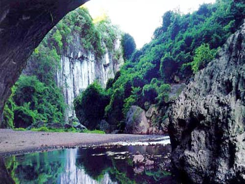 天生橋橋身有石洞數(shù)個,有的可通橋頂,有的則深淺不一,洞中有無數(shù)蝙蝠棲息其中。橋頂和橋壁兩側(cè)石柱、石筍、石巖千姿百態(tài),有似長夜明燈、有似威猛武士,有的則像天馬行空隱然欲去。絕壁之上,古松怒立,植被蔥蘢,環(huán)境幽深絕倫。天橋之下,流水潺潺,波光粼粼;碧潭之內(nèi),山光樹影,倒映其中。每當陽光斜照,鳥語、松風、流水聲,相互暉映。古人曾有詩贊“人鑿難施鬼斧窮,天心不厭地玲瓏,西山壁上鼉梁架,巧妙爭傳造化工。”