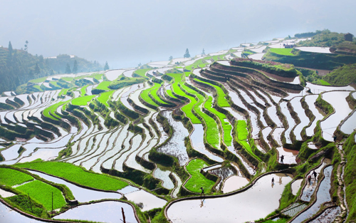 加榜梯田是“稻飯魚羹”苗族人世世代代辛勤的杰作,加榜梯田都吸取了天下梯田之精華,它比云南元陽梯田更加秀麗,比廣西龍勝梯田更加壯觀。特別是那居于梯田間的山村吊腳樓與層層梯田朝相輝映。構(gòu)筑出一幅幅美麗的和諧家園。從黨扭村至加榜鄉(xiāng)連綿25 公里簡(jiǎn)易鄉(xiāng)村公路上梯田一片連著一片,層層疊疊,雄偉壯麗,形形態(tài)各異。有的婉如苗家姑娘編織的一條條彩帶,盤繞在崇山峻嶺中,最長(zhǎng)的近1千米,而最短的用一頂斗笠便能蓋過。而那些散落在梯田中間獨(dú)具苗鄉(xiāng)特色的吊腳樓,恰似五線譜中的一顆顆跳動(dòng)的音符。梯田從加車河谷繞著山梁向上攀升,像一座“天梯”連接著天地間,梯帶高低落差近千米。春天,層層注水后的梯田更加婀娜,無論在陽光、月色或晨曦里,條條銀輝色的梯田在山野閃爍著銀色的光芒,陽光灑落在層層梯田之上,透出大地的光輝,逶迤疊卷,深沉、含蓄而悠遠(yuǎn)。