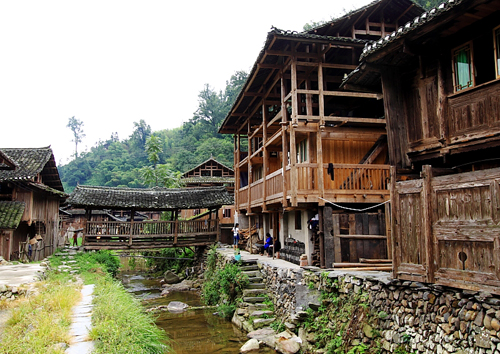 大利多戶人家,一幢幢青瓦木屋錯落在縱橫交錯的三條小溪兩岸。戶與戶之間是石板路相通,有花橋、小橋相連,布局好似園林格局。那五座花橋,以其玲瓏秀美的身姿佇立于寨中、寨頭、寨尾,是大利人歇腳納涼、集會議事、行歌坐夜的場所。溪流從大山深處緩緩淌來,在石頭間叮咚小唱。溪水涼爽泌人心脾,清澈見底,鯽魚、蛇花魚、袍魚等成群結(jié)隊(duì)地在水中游戲,坐在屋檐下,便可感受水的涼意,還可觀魚、垂釣。溪中石頭怪狀嶙峋,有的像怪獸,有的如桌如凳,天氣炎熱的時候,農(nóng)家常從家中搬來飯菜,在石桌上擺著吃。在小溪下游距寨子不遠(yuǎn)處,有幾個巨大而富有傳奇色彩,被譽(yù)為石硯、神筆的奇石,其形酷似硯、筆,尤如能工匠心雕琢。寨中臨溪那幢古色古香的四合院最為引人注目,建在青石板鋪就的地基上,其布局巧妙、工藝講究、氣勢雄奇。這幢侗室四合院有立柱48根,3層,走進(jìn)大門,中間是一個敞亮的天井;24扇門,大門中門上方有雕匾;36個窗,窗有花格。此屋建于道光年間,1980年曾有家族14戶,93人共同居住。大利侗室四合院舊時有8幢,現(xiàn)僅存2幢,其6幢毀于咸豐同治年間兵亂。