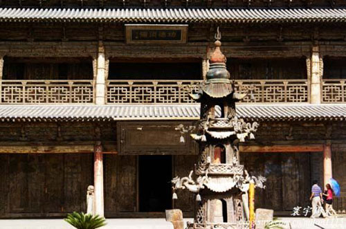 大殿坐東面西,面闊九間48.3米,進深7間,24.5米,殿高20.2米,重檐歇山頂。底層四周外沿環以回廊。大殿佛壇上橫躺著一尊臥佛,系釋迦牟尼涅槃塑像,為木胎泥塑,長34.5米,肩寬7.5米,腳長5.2米,為中國最大室內臥佛。