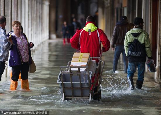 當地時間2013年10月7日,意大利威尼斯,威尼斯迎來秋季首次漲潮,整個城市大街小巷被水淹沒。