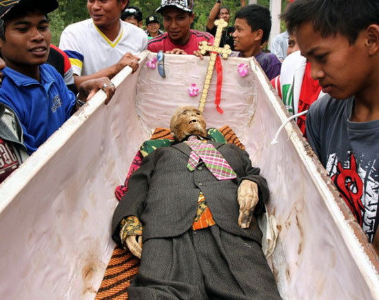 在印度尼西亞三年一次的Ma'nene傳統(tǒng)活動中,當(dāng)?shù)厝藭䦟⑵渥嫦葟膲災(zāi)怪型诰虺鰜恚ㄟ^精心的打扮這些遺體,來緬懷他們已故的祖先。而這種方式的紀(jì)念活動,并非所有文化背景的人都能接受。許多不知情游客看見一具具幾近木乃伊的遺體時(shí)全都嚇傻眼,連忙離開現(xiàn)場。