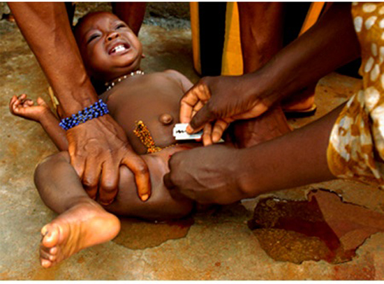 在非洲至今還存在切除女性陰戶的習俗。女孩大陰唇的部分或全部被切除,外陰兩側用洋槐刺穿在一起或用腸線縫合,只留下一個小小的間隙以便尿與經血流出。大多數情況下,切除手術是由民間醫生在沒有實施麻醉、沒有任何衛生保障的條件下實行的。傳統的切割工具是鐵刀或小刀片,縫合使用的是一般針線,有的地方甚至使用荊棘。這些工具使用之前完全不經過消毒。手術時并不顧及隱私,從外面的空地到浴室的地板上,任何地方都可以是手術臺。
