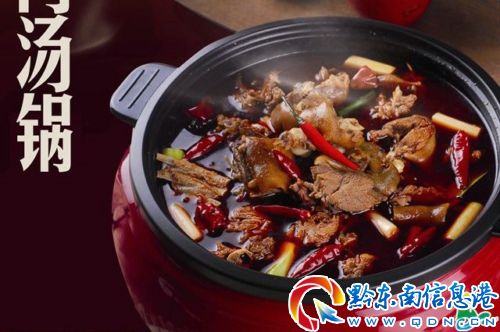 “狗肉湯鍋”是苗族傳統名菜。將狗肉砍成小塊用文火純熟,蓮塘帶汁舀于小鍋內,架于“三腳”上,下燒炭火。鍋上設一調勻“狗肉香”、山萘、辣蓼、芫荽、茴香、麻油、花椒、醬油、醋、味精、辣面等香料的“蘸水”調味,味道鮮美。