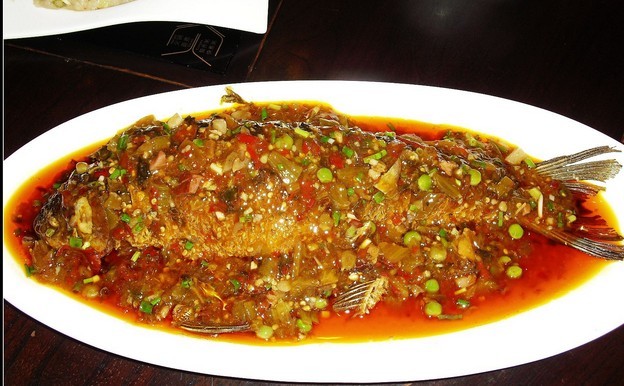 工藝:將鮮魚治凈。在魚身上剞花刀紋,用醬油、花椒、精鹽腌入味。炒鍋燒熱,下油,燒至七成熱,放魚炸,至呈金黃色時取出。鍋內留余油,下鹽酸菜煸炒二三分鐘,下姜、蔥、蒜片、味精、高湯,將魚放入,用大火燒沸,較小火烤至鹵汁收緊,將魚撈出裝盤。鍋內留鹵汁,下濕淀粉勾芡,澆在魚上即成。