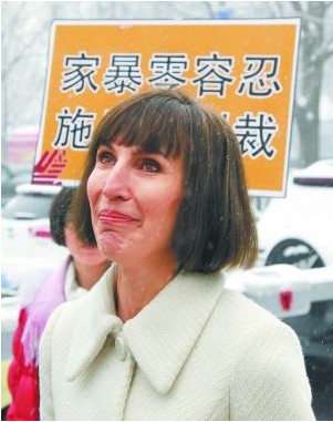 案件宣判前,北京朝陽(yáng)法院門(mén)口一位身穿白色婚紗的短發(fā)女子引起了路人的圍觀,她手持兩塊標(biāo)語(yǔ)牌,分別寫(xiě)著“家暴零容忍,施暴須制裁”“鄙視你,施暴者李陽(yáng)”,潔白婚紗上點(diǎn)點(diǎn)代表血跡的紅色在雪地里尤為醒目。李金的代理律師戚連峰對(duì)此表示: