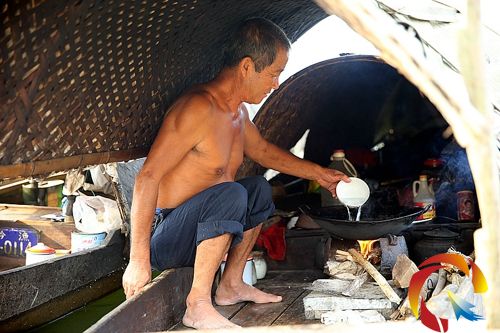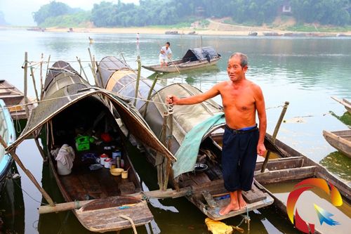 榕江縣古州鎮場壩社區大河口渡口,梁運全老人站在自己以此為家的小木船上