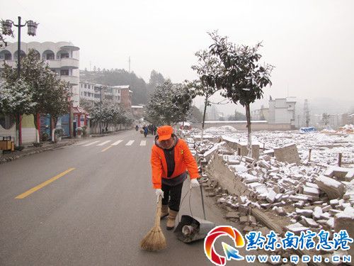 1月10日夜晚,雷山縣風雪交加。1月11日,全縣白雪皚皚,風雪蓋地。清晨,當人們還蜷縮在溫床暖被的時候,當人們在圍坐在熱爐旁的時候,雷山縣城253名環衛女工們早已在縣城各個街道清掃衛生了。【雷山:風雪中 “橘黃色”在行動】