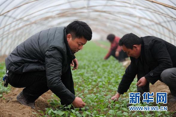 資料圖片:1月30日,王民主(左)在蔬菜大棚內勞作。 1978年出生的王民主是安徽省宿州市埇橋區桃園鎮桃東村的農民,2011年底,他與姑父、舅舅等親戚合伙湊了100多萬元,通過土地流轉的方式承包下當地500余畝土地,成立了一個現代農業示范基地,當起一名家庭農場主。 新華社記者 杜宇 攝
