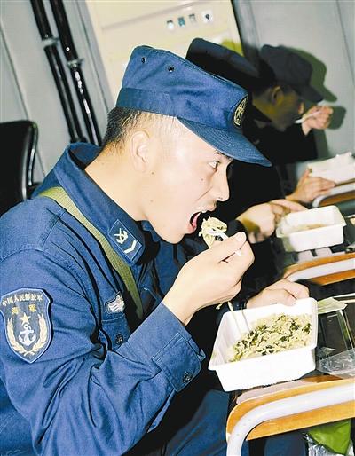 “青島”艦上的官兵在戰位上吃野戰快餐。記者 米晉國攝