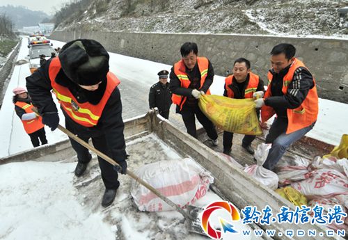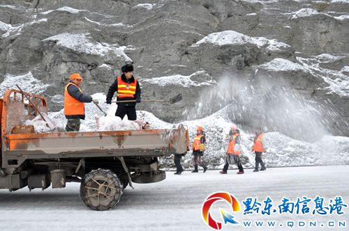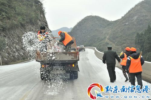 凱里公路管理段啟動自然災害緊急預案,組織85名職工趕赴現場,緊急開展撒鹽化冰及破冰開道作業,引導車輛安全通過。當日共撒化冰鹽12噸,救助路上受難汽車5輛,未造成大量車輛及人員長時間集中滯留狀況。(陳沛亮 姚仕威 攝影報道)